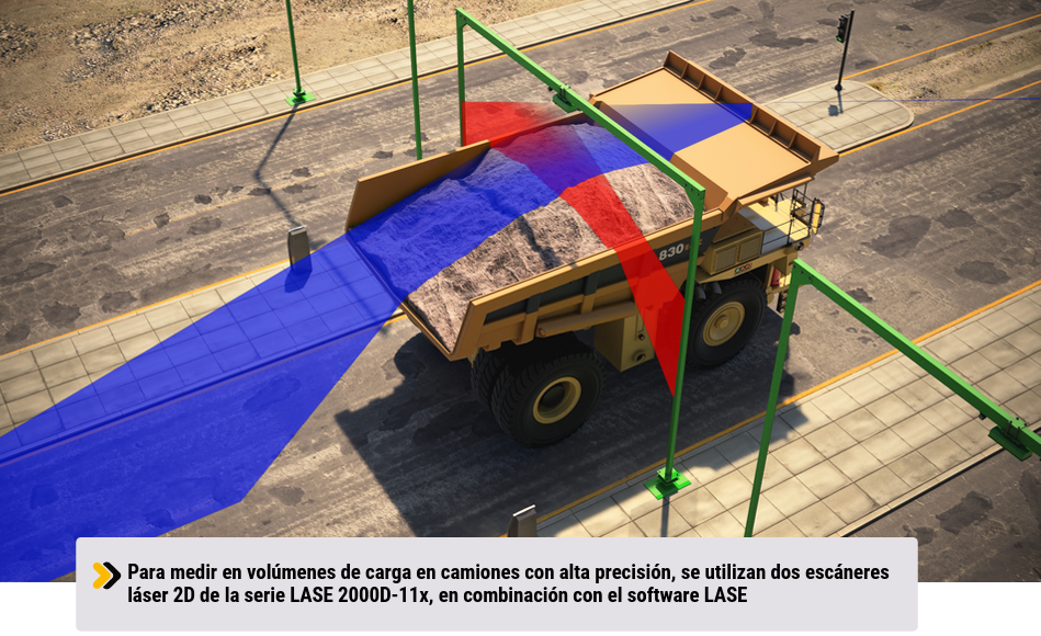 Los escáneres láser están montados en un marco sobre el carril de camiones: uno mide el perfil transversal de la carga y el otro rastrea el camión cuando pasa por el área de medición, generando una imagen 3D que entrega el volumen exacto de la carga.