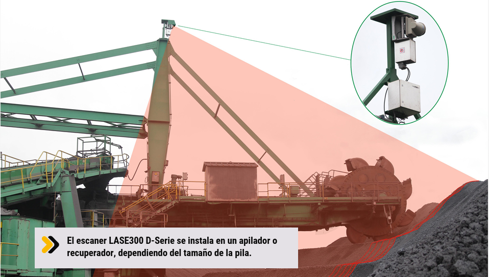 El escáner “mira” desde la maquina en cualquier ángulo, entrega los perfiles y escanea la pila. En relación con la posición de la maquina (incluidos los ángulos) se genera un perfil de apilamiento tridimensional. Durante la calibración se genera un “perfil 0” y la imagen 3D actual de la pila se puede compensar con este perfil en una operación posterior.